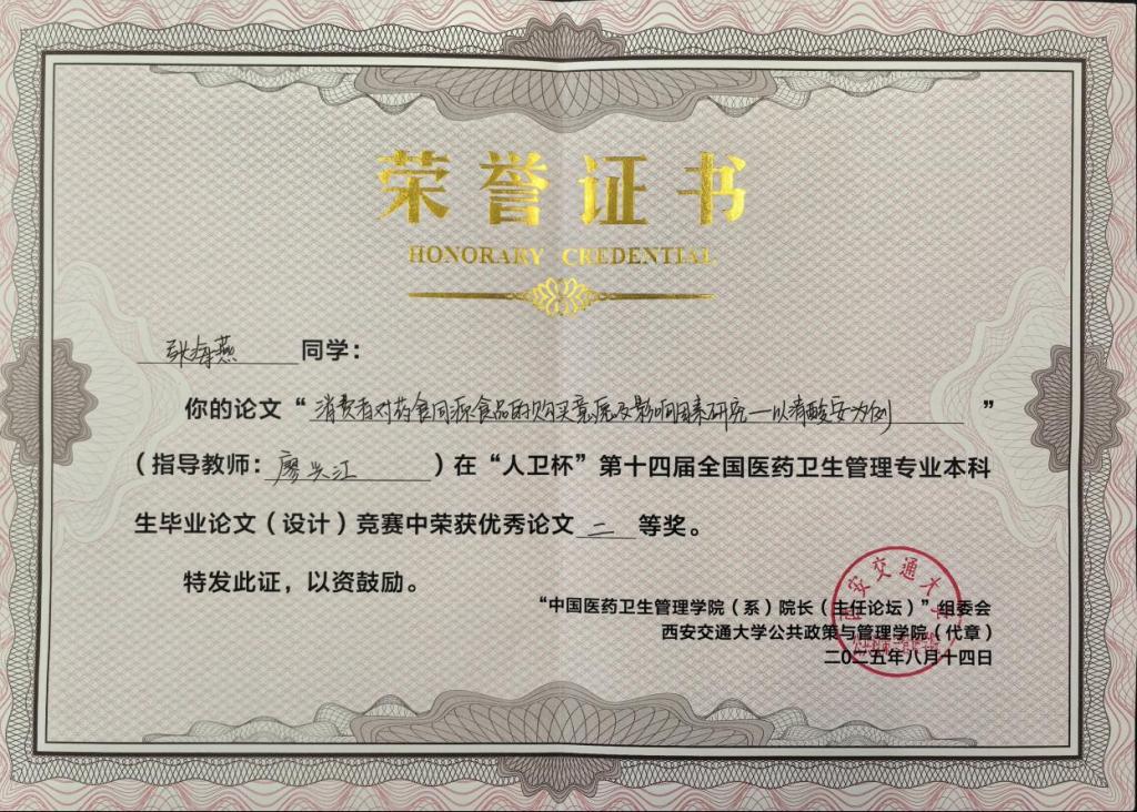 2025年8月,第二十一届“中国医药卫生管理学院(系)院长(主任)论坛”暨第十四届“人卫杯”全国医药卫生管理专业本科生毕业论文(设计)竞赛在西安举行。我院2021级市场营销专业本科学生张海燕撰写的本科毕业论文《消费者对药食同源食品的购买意愿及影响因素研究—以清酸安为例》荣获优秀论文二等奖,2021级公共事业管理专业本科学生张跃菊撰写的本科毕业论文《延迟退休背景下贵州老年人健康状况对其劳动力供给的影响研究》荣获优秀论文三等奖。