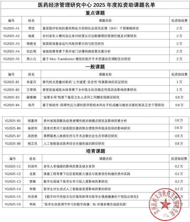 经“医药经济管理研究中心”前期征集遴选和审核,现将2025年度医药经济管理研究中心项目立项名单予以公布。今年公示的拟立项课题为19项。